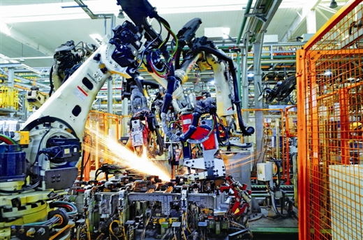 ?????????? ???? 7月9日,廣西汽車集團自動化焊接生產線的工業(yè)機器人在焊接汽車構件。該集團近三年增加機器人300多臺,建成18條自動化生產線,凝成多種重要汽車部件的生產能力。今年,1-6月份,該集團汽車制造業(yè)務收入實現(xiàn)78.02億元,同比增長15%。使用機器人已成為柳州80%以上工業(yè)企業(yè)的意愿。